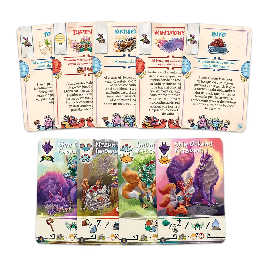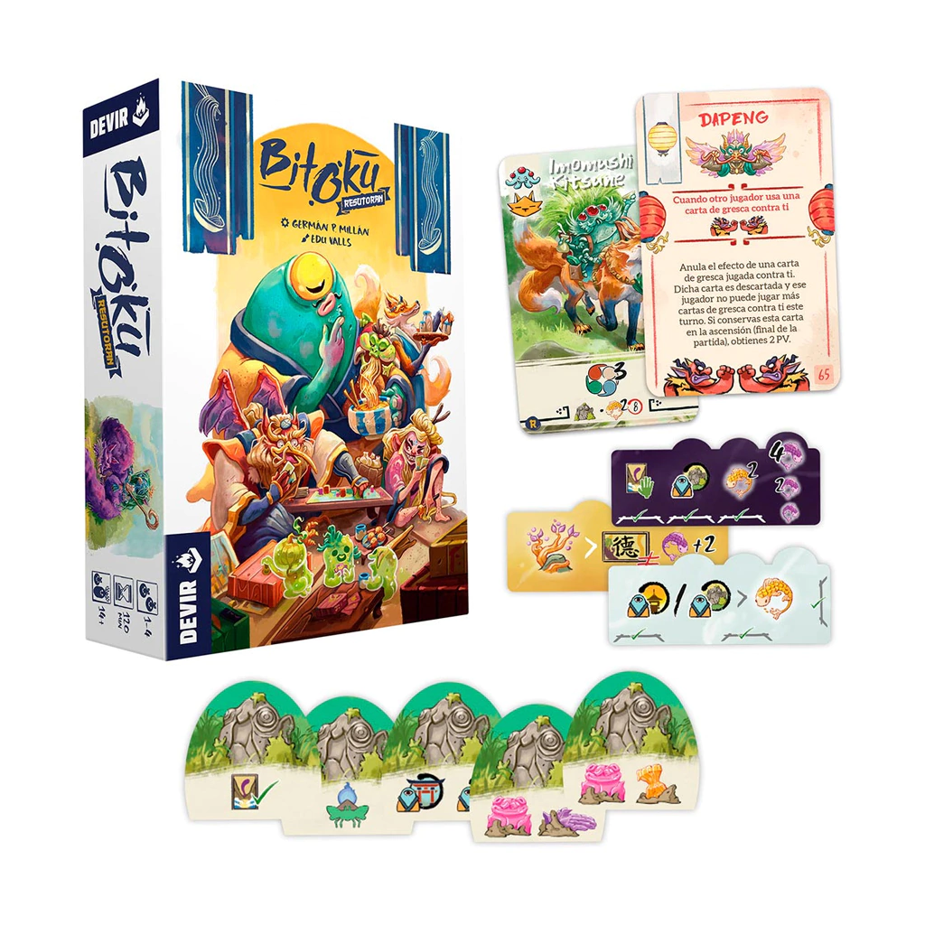 ¿Cómo? ¿Todavía no conoces Bitoku? Deja que te haga un pequeño resumen: en este juego los jugadores toman el papel de espíritus del bosque en su camino hacia la trascendencia, con el objetivo de elevarse y convertirse en el próximo gran espíritu del bosque. Para ello contarán con la ayuda de los yokai, los kodamas y los distintos peregrinos que los acompañarán en el camino. Los jugadores deberán gestionar su mano de cartas, llamando a los yokai en el momento y lugar correctos para obtener el máximo provecho a las habilidades que estos les ofrecen. Así mismo, durante la partida podrán ganar más cartas de yokai que añadir a su mazo, con tal de mejorar sus opciones y lograr una mayor puntuación. Además, cada jugador contará con tres guardianes yokai (en forma de dados) que podrá mandar a las grandes regiones del bosque en el tablero principal para obtener todo tipo de nuevas opciones que poner en uso durante la partida. Estas opciones pueden tener la forma de edificios que pueden erigirse en ciertas zonas del bosque, cristales del alma que nos generen recursos al realizar determinadas acciones o muchas otras. Los jugadores también tendrán la oportunidad de ayudar a los mitamas, almas en pena en busca de redención, gracias a las libélulas chinkon