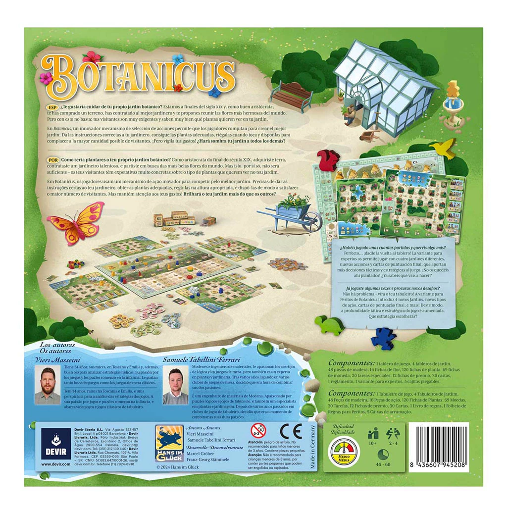 Diseñado por Vieri Masseini y Samuele Tabellini, con ilustraciones de Marcel Gröber, Botanicus es un juego para 2 a 4 jugadores, recomendado a partir de 10 años, con partidas de 45 a 60 minutos. El objetivo es obtener más puntos de victoria que los demás jugadores completando tareas, progresando en los marcadores o cultivando un jardín botánico espectacular.