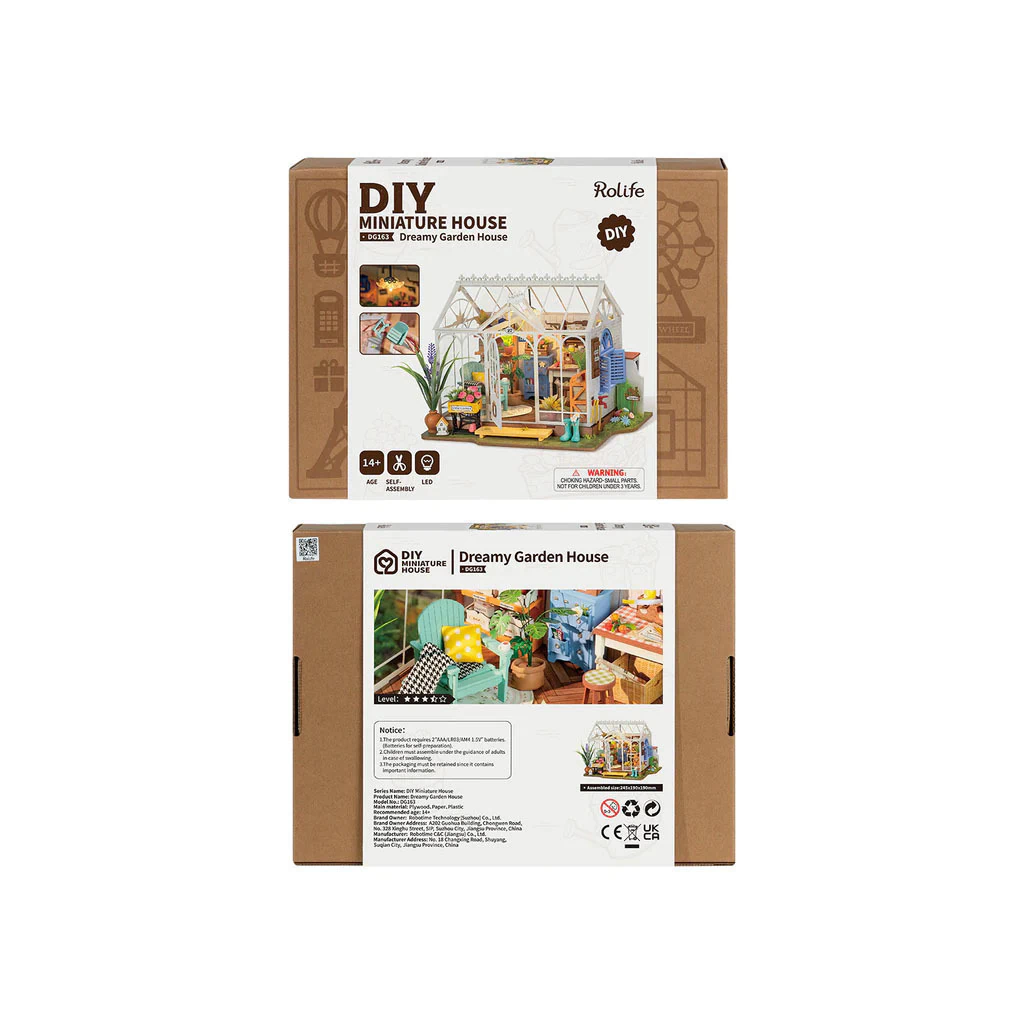 La puerta de entrada, los marcos exteriores transparentes y la ventana lateral reflejan de esta maqueta reeflejan la inspiración en la artiquectura europea. Cuenta con un espacioso invernadero transparente con una caseta de jardín secreta en su interior y una zona donde hay semillas, regaderas, macetas y más kits de jardineria.