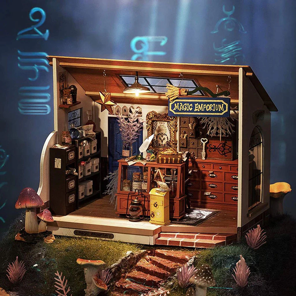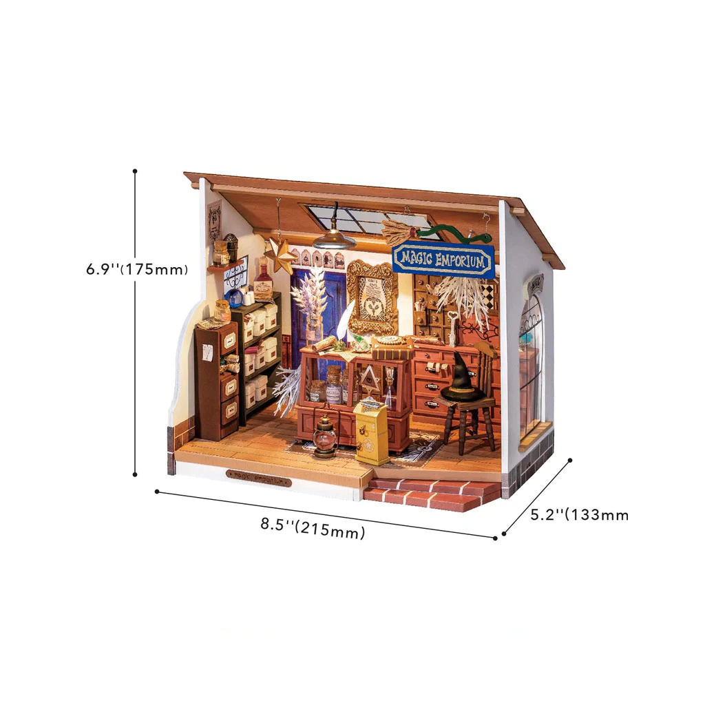Crea una escena de tienda misteriosa con colores clásicos y muchos elementos mágicos. La dueña, Kiki, tiene la magia y los tesoros más poderosos del mundo. Este asombroso emporio mágico tiene diseños y detalles elaborados. El sombrero de bruja en la silla y la foto del búho indican la identidad del dueño de la tienda. Dentro del gabinete hay frascos extraños y muchos objetos pequeños. Además, hay símbolos desconocidos por todas partes, lo que aumenta la atmósfera misteriosa.