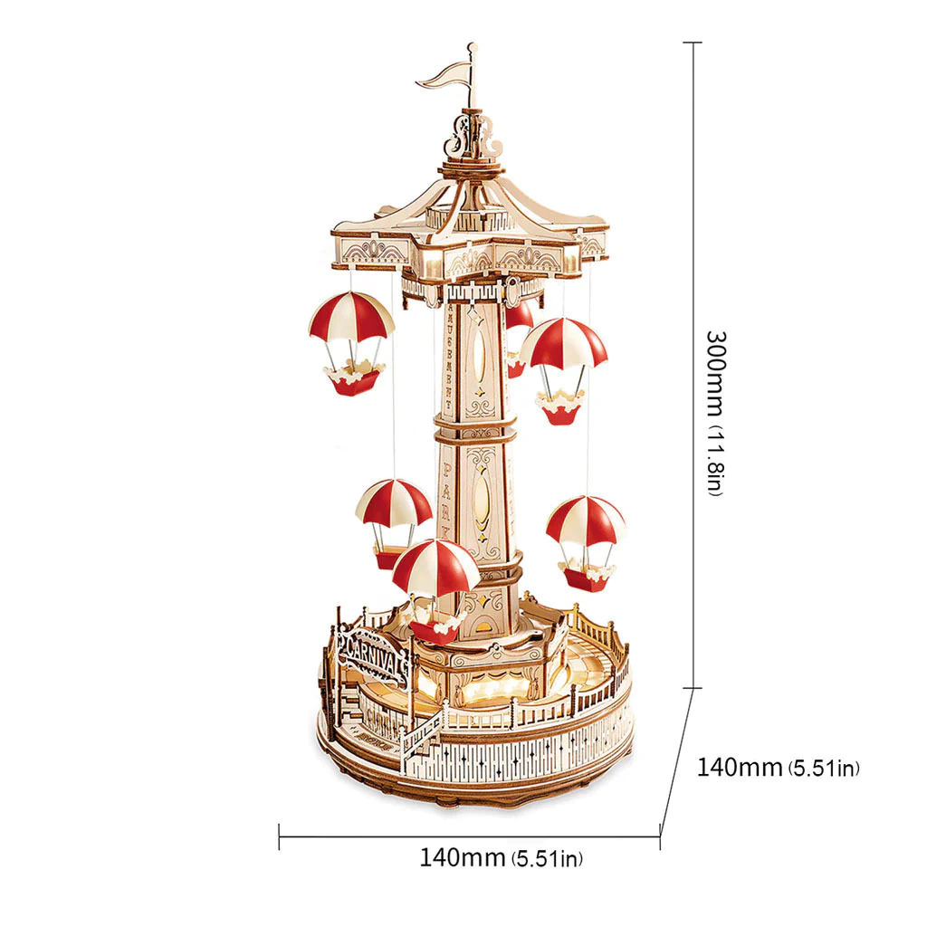 Torre de paracaídas, con colores rojos y blancos festivos y clásicos. El modelo gira y tiene sonido.