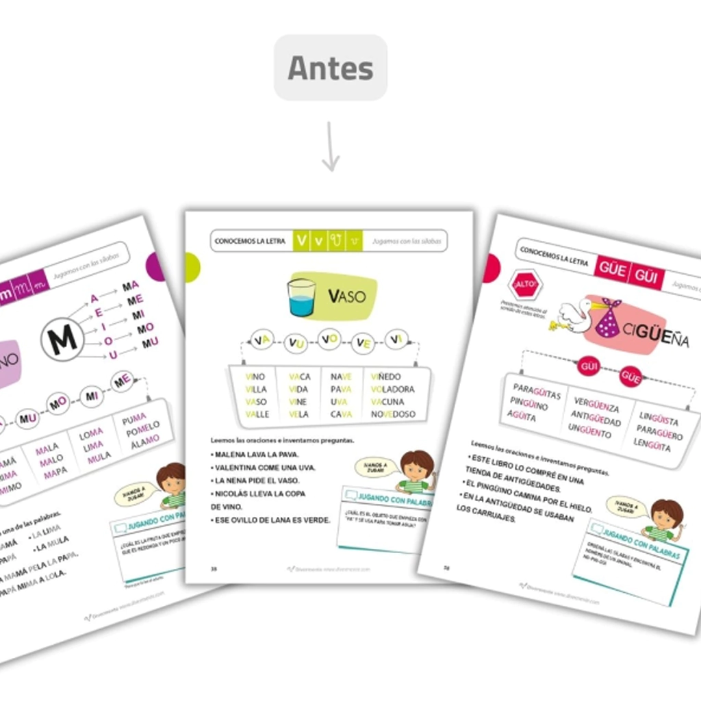 Juegos en todas las hojas: Cada letra presentada cuenta con un desafío (Adivinanzas, Jugando con Palabras, Adivina Palabra y Deletreo) que se responde con alguna palabra trabajada en la hoja ¡Lo que hace el aprendizaje más divertido y dinámico y por lo tanto más efectivo!