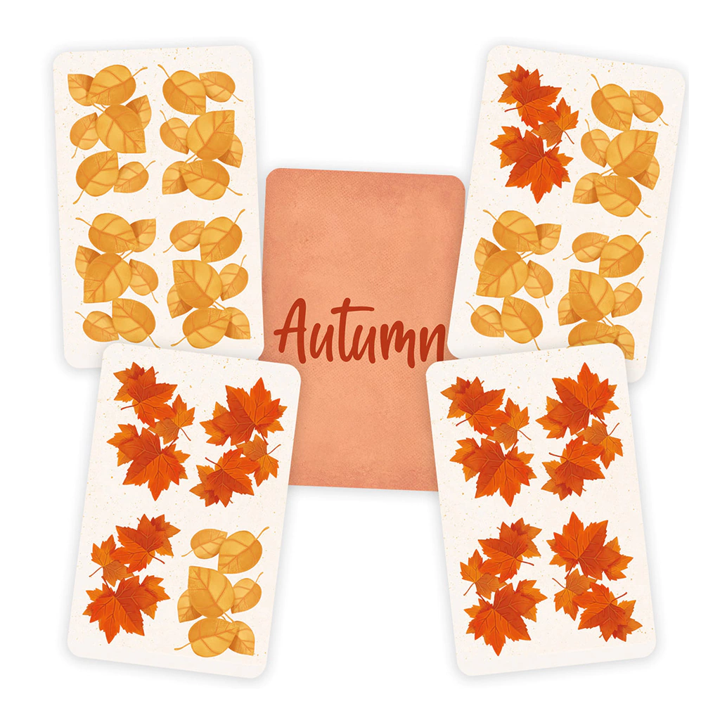 Diseñado por María Blasco y Enrique Blasco (aunque estos dos hermanos también son conocidos como Brote de juegos) e ilustrado por Carlos Ureta, Autumn es un juego de la saga 4 seasons que se suma a la colección pocket de Devir. Si ya conoces Winter, título de los mismos autores y que también forma parte de la saga, este juego te resultará muy familiar. Con solo 18 cartas que muestran cuatro grupos de hojas de dos colores distintos, Autumn permite partidas rápidas a 2 jugadores o en solitario, a partir de 8 años.