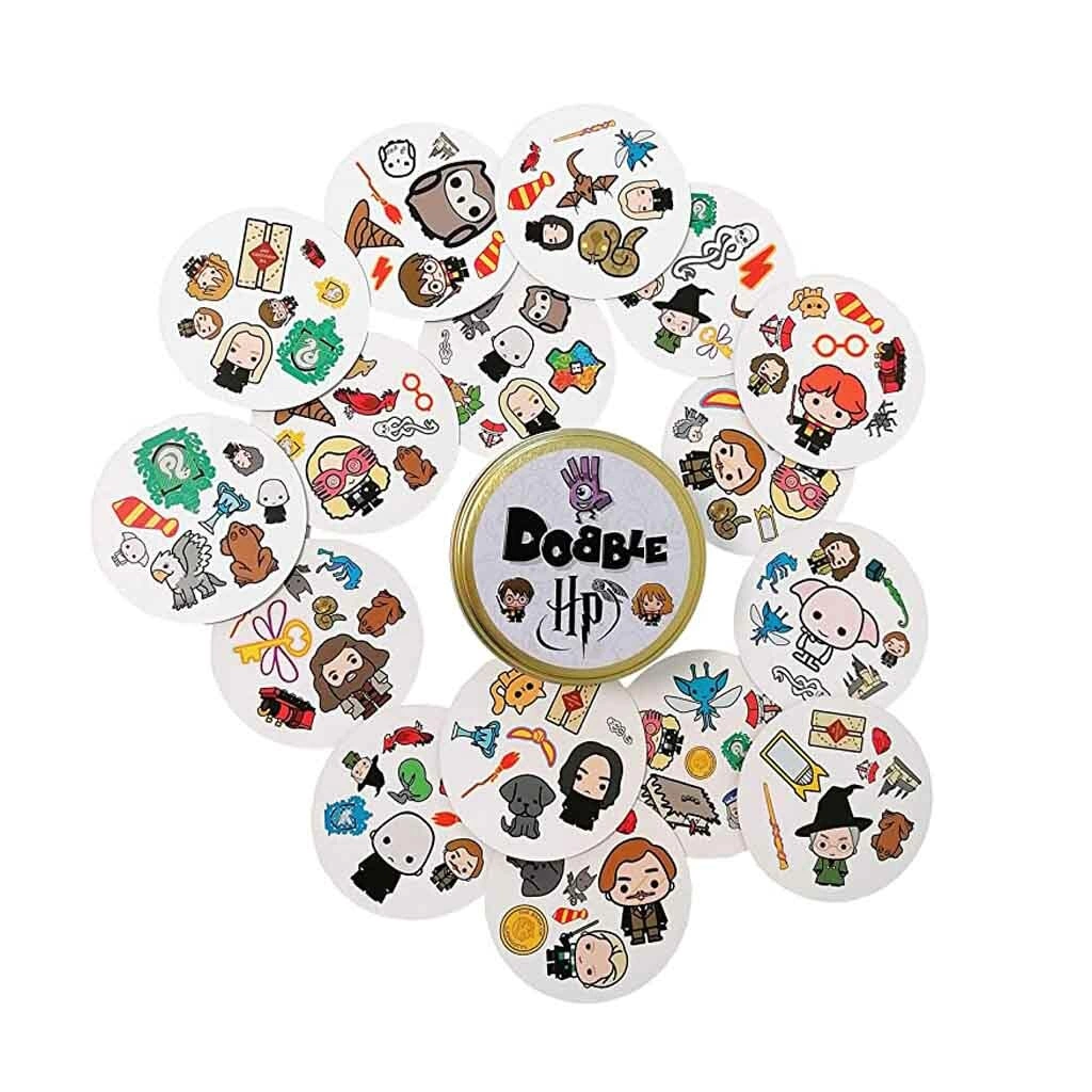 Dobble harry potter es un juego en el tendrás que descubrir qué personaje, objeto, bestia fantástica o símbolo de las historias de hogwarts se repite entre dos cartas