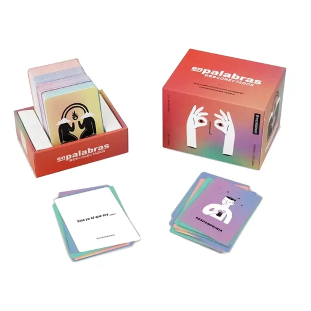 DESCONECTADOS es un juego de cartas diseñado para conectar con familia, amig@s o pareja. Contiene 200 cartas que funcionan como disparadores para compartir pensamientos, emociones y reflexiones que a menudo el ritmo de la vida nos impide. Perfecto para promover debates y conexiones profundas en un ambiente relajado y divertido.
