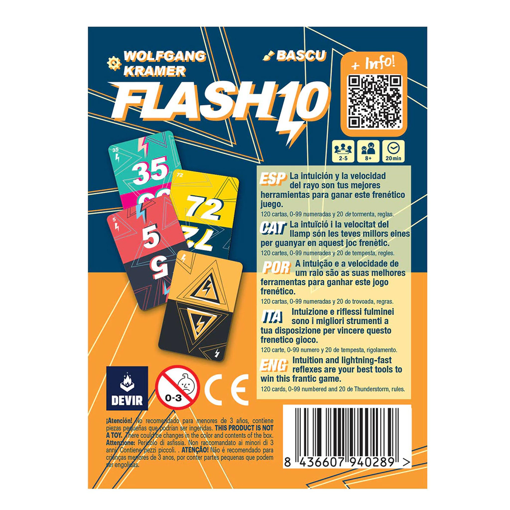 Diseñado por el legendario Wolfgang Kramer (autor de juegazos como El Grande o Downforce), Flash 10 es un nuevo título de la colección pocket de Devir. Este frenético juego de cartas permite partidas para grupos de 2 a 5 jugadores, a partir de 8 años. El objetivo del juego consiste en sumar más puntos que el resto, creando una fila de cartas de izquierda a derecha en orden ascendente.