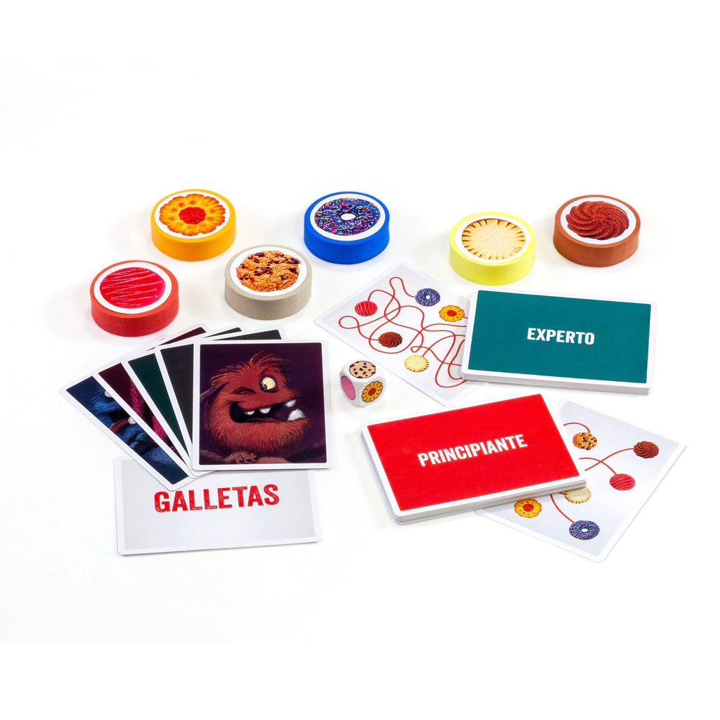 34 cartas de juego: 17 de nivel principiante (dorso color rojo) y 17 de nivel experto (dorso color verde); 6 cartas de monstruo; 6 fichas de galletas; 1 dado y 1 reglamento.