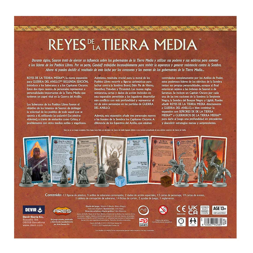 ¡Expande Guerra del Anillo con el poder de los antiguos reyes y gobernantes de los Pueblos Libres! Reyes de la Tierra Media es una expansión que requiere el juego base y que incluye 13 figuras de plástica, 5 anillos de soberano corrompido, 2 dados de acción especial, más de 30 nuevas cartas, 1 tablero de corrupción de soberano y 14 contadores, además de hojas de referencia y el reglamento.