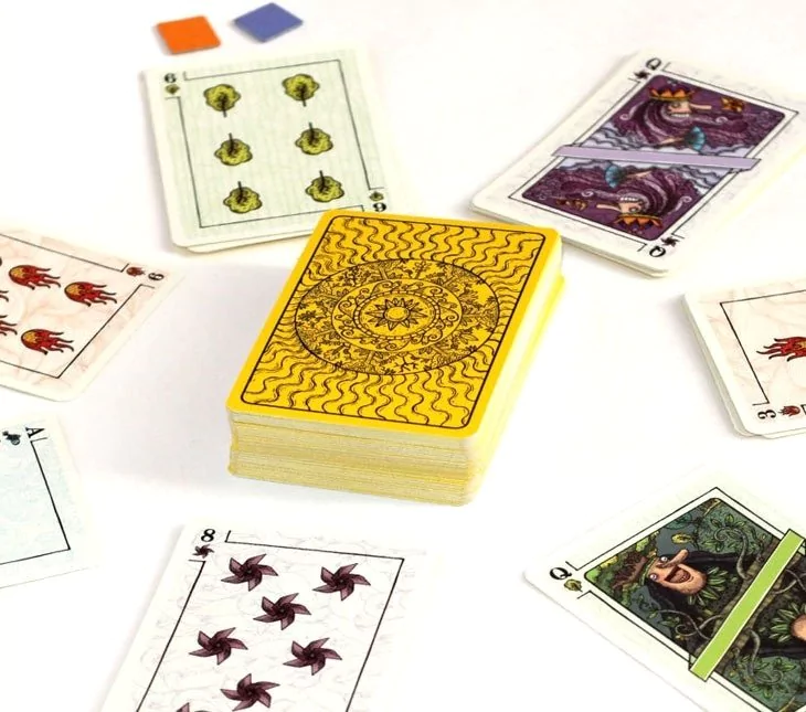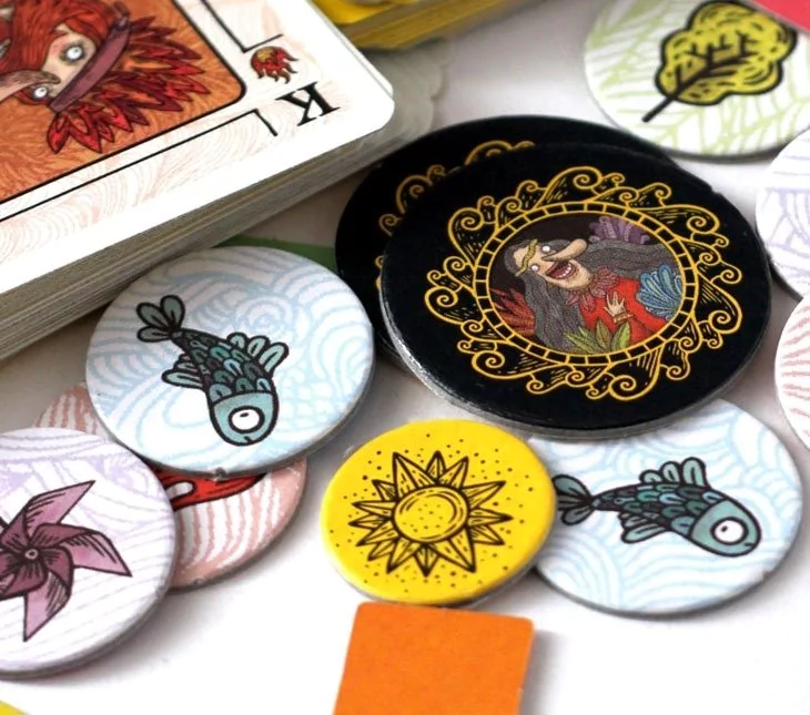 2 mazos de 52 cartas / 35 Macas / 8 amuletos / 24 fichas de elementos / 15 monedas / reglamento