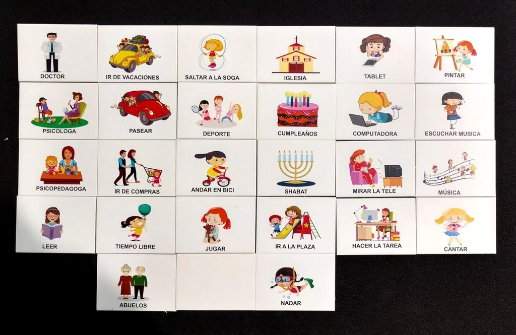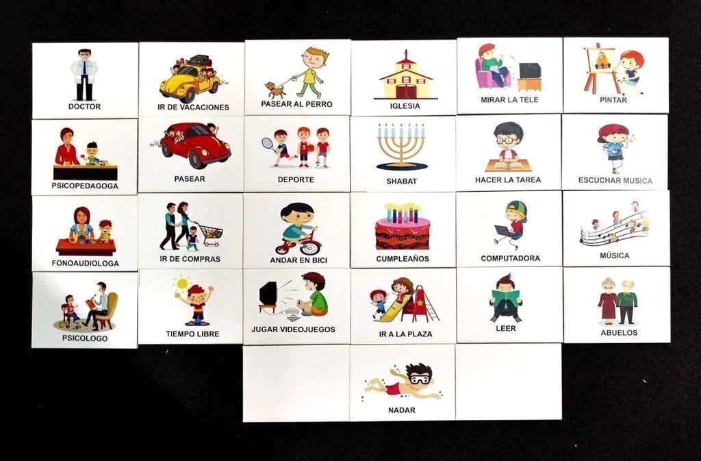 Los pictogramas miden 5 x 7 cm. son de cartón rígido de 2 mm de espesor y tienen imán o abrojo según el modelo de pizarra.