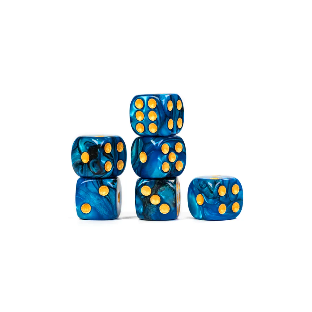 Set de dados d6 negro y azul marmolados con acentos dorados
