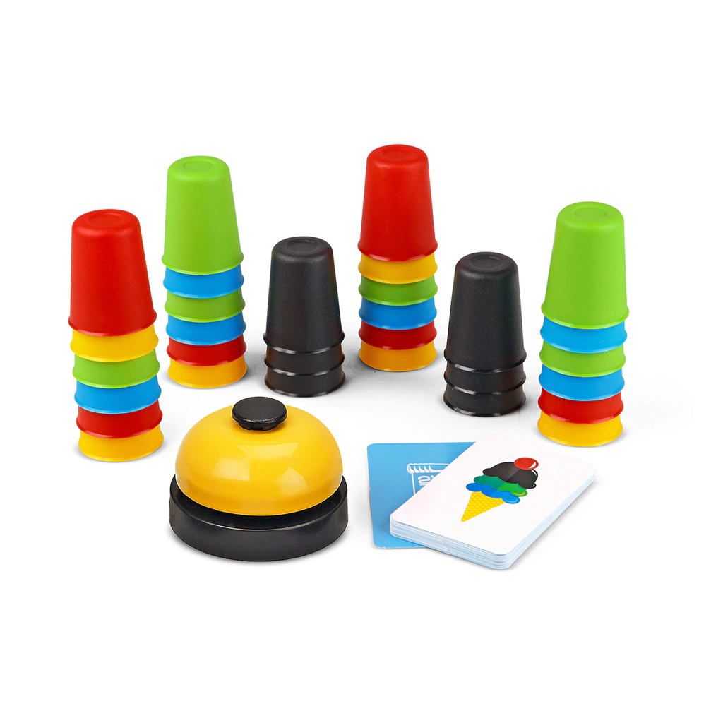Se reparte un cubilete de cada color a cada jugador y se coloca el mazo de cartas y el timbre en el centro de la mesa. En cada turno, se revela una carta y todos deben colocar los cubiletes en el orden indicado por la carta. El primer jugador en completar el orden debe tocar el timbre para ganar la carta como recompensa. El juego continúa hasta que se acaben las cartas, y el jugador con más cartas al final será el ganador.