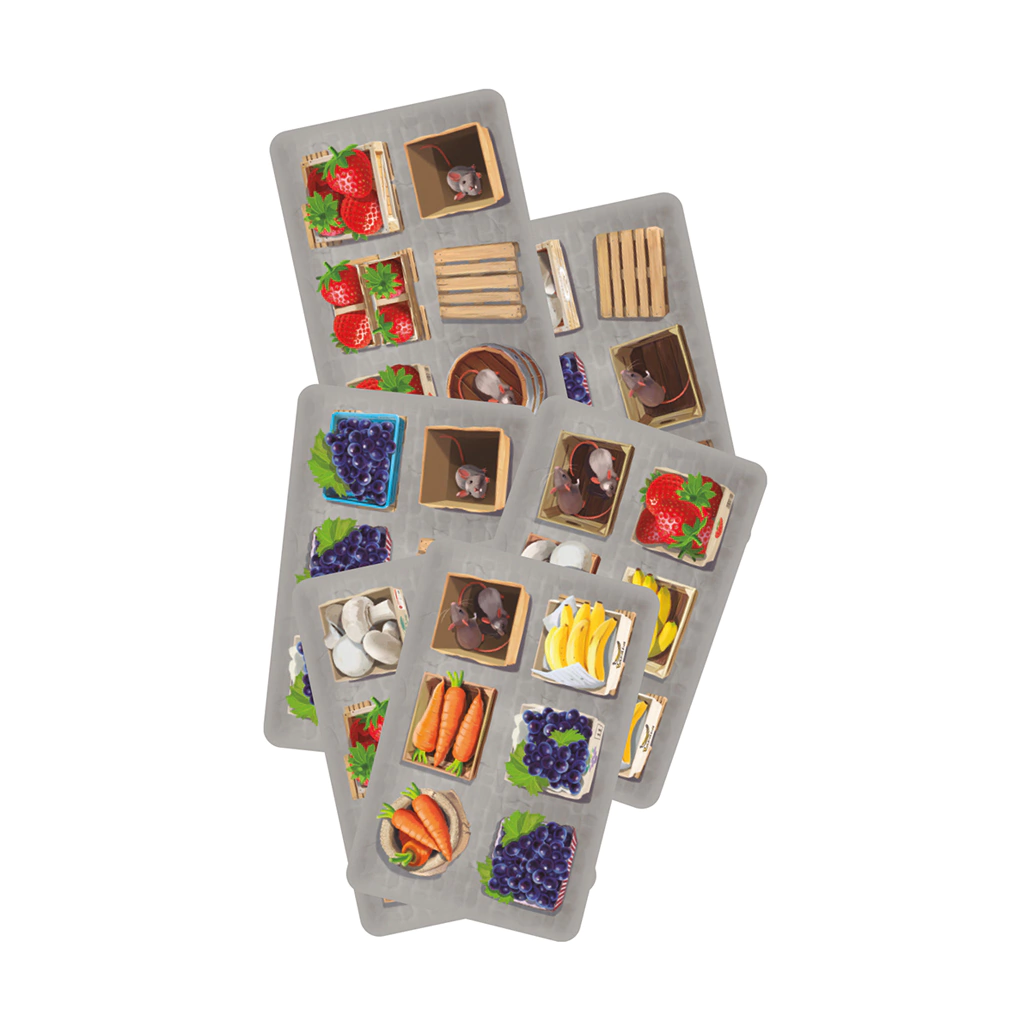 Todas las cartas tienen una estructura similar. Siempre encontrarán seis espacios que pueden estar ocupados por tres tipos de símbolos: cualquiera de los cinco tipos de frutas y verduras (fresas, plátanos, uvas, setas y zanahorias), cajas y palés vacíos o bien ratones. Como podrán imaginar, hay que hacer todo lo posible para conservar las mercancías y evitar cajas vacías y ratones.